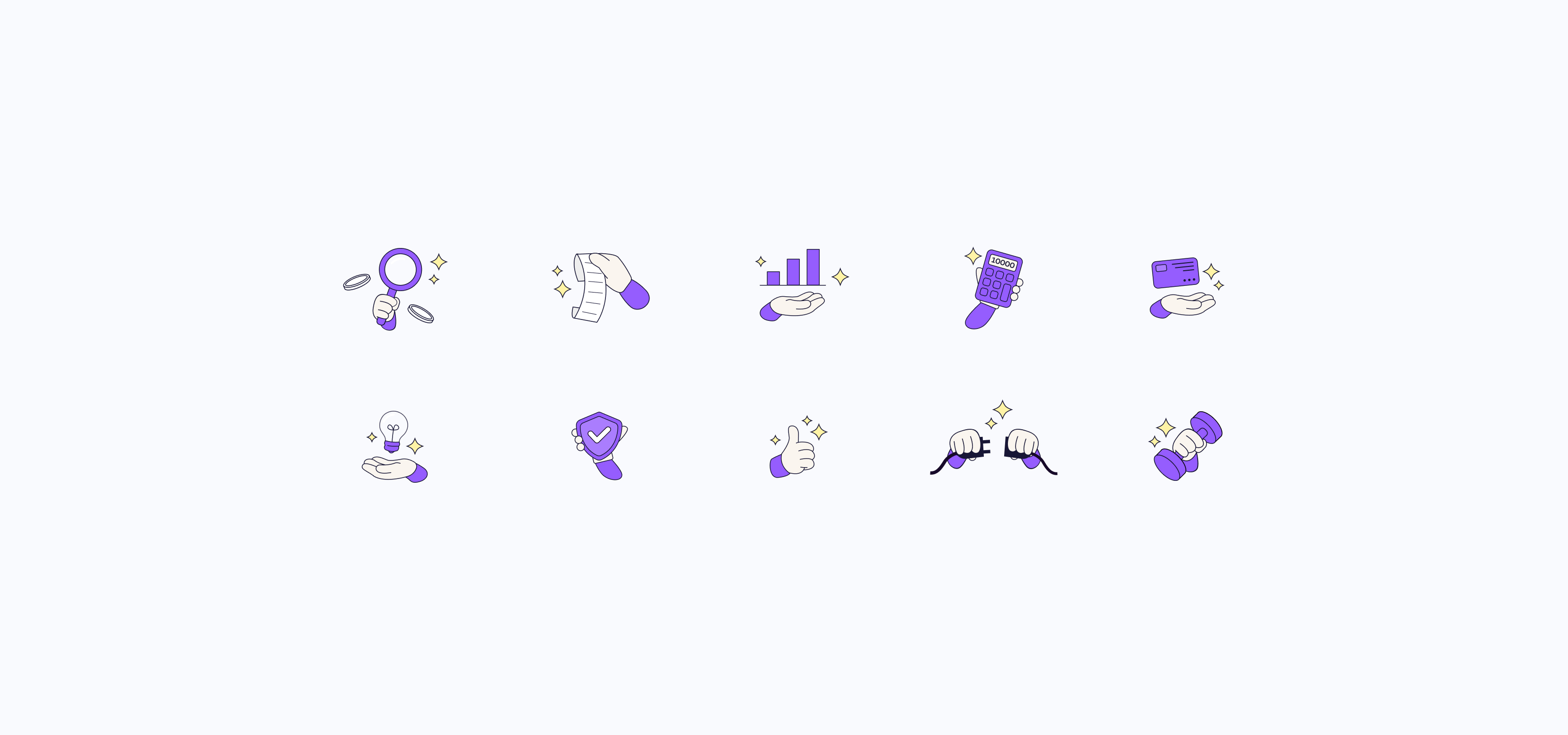 Om het merk meer persoonlijkheid te geven bracht ik Boekie tot leven in allerlei situaties. Boekie neemt voor jou dingen uit handen. Om de strakke user interface op te breken maakte iconen-set van zijn handen die allerlei handelingen voor jou uitvoert. De kleur paars paste perfect bij het innovatieve en het creator-archetype van Boekie, maar daar voegde ik het zachte geel aan toe om warmte en persoonlijkheid in te brengen.